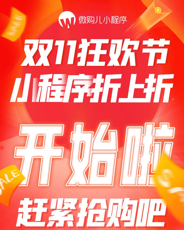 微购儿小程序双十一限时活动已上线! 活动内容如下: 1.活动时间:11月1日-11月12日 2.参与活动产品如下: ①分销商城小程序 ②社区团购小程序 ③同城信息小程序 ④餐饮外卖O2O版小程序 ⑤美...